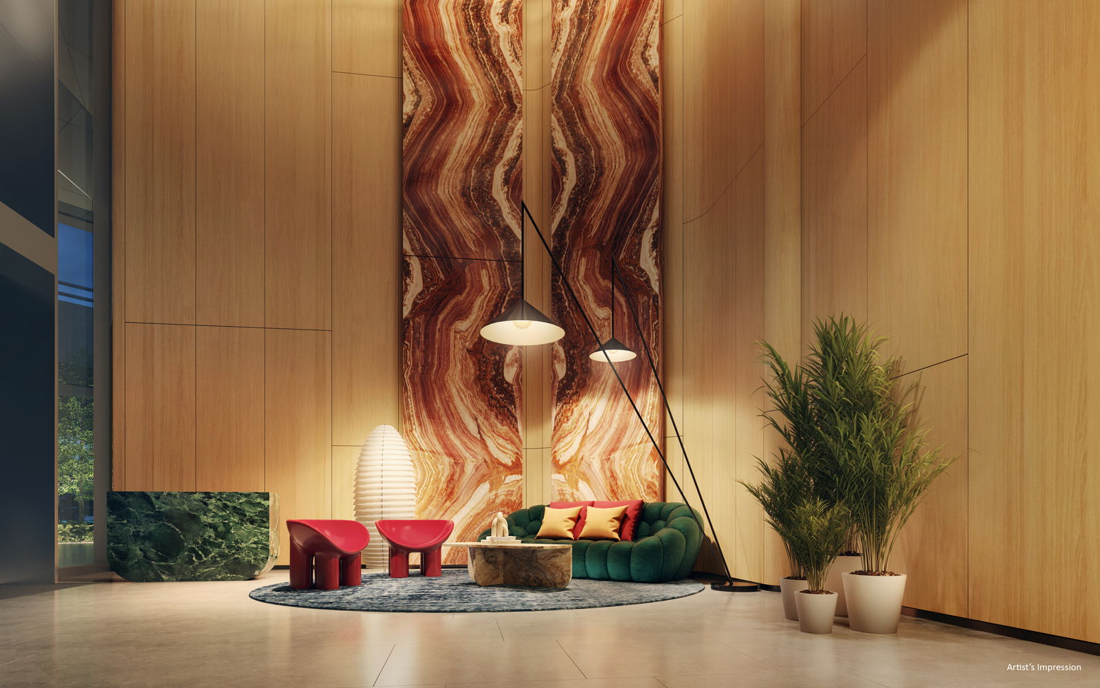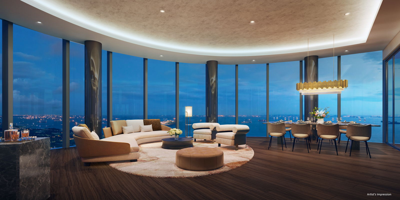 All residential units start from Level 23, ensuring that even the lowest floors enjoy clear sightlines. The tower’s triangular form and island-site positioning allow many units to capture panoramic views of the city skyline, sea, and the future Greater Southern Waterfront.