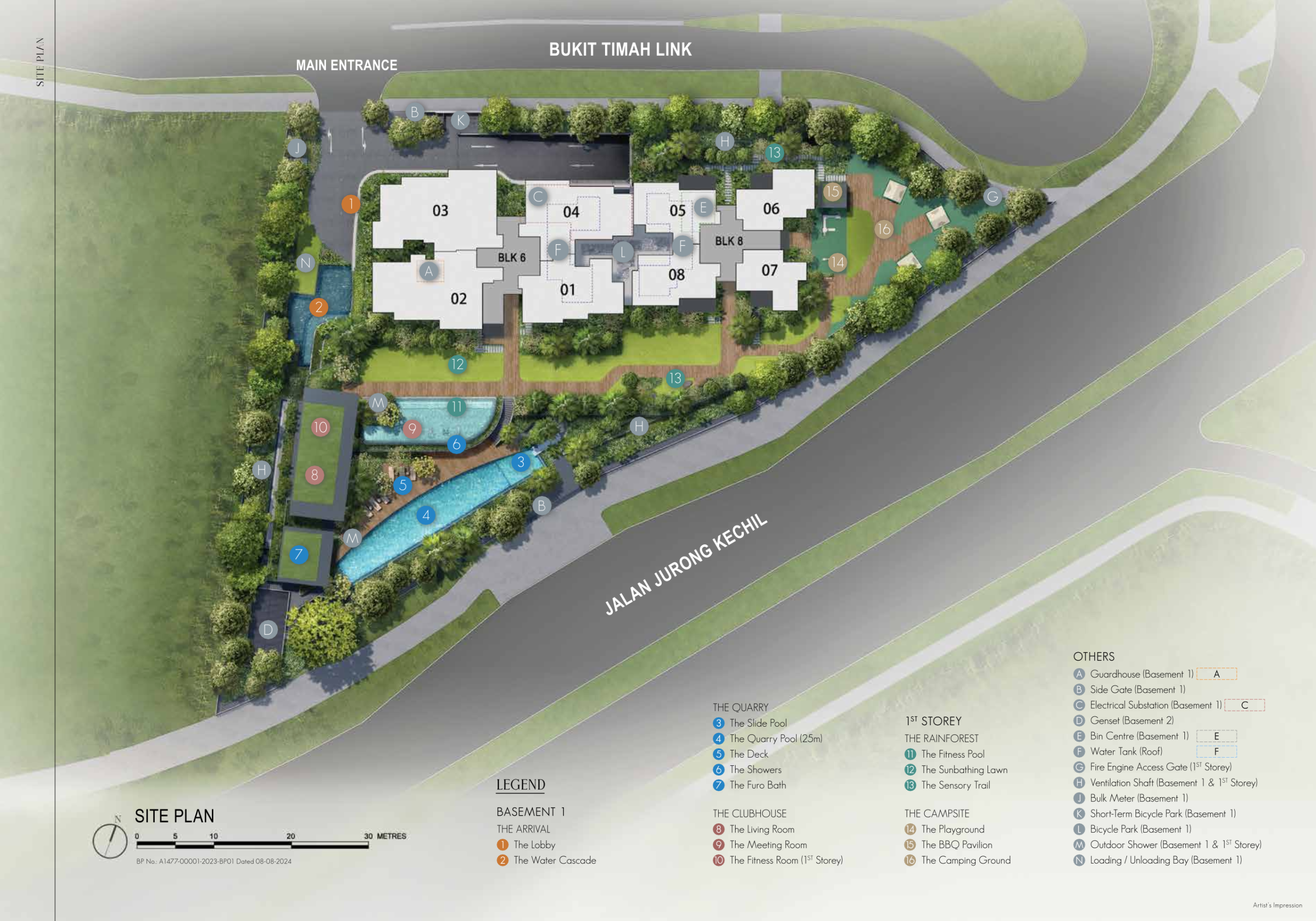The Lobby, The Water Cascade, The Fitness Pool, Sunbathing Lawn, Sensory Trail, Slide Pool, Quarry Pool, The Deck, Showers, Furo Bath, Playground, BBQ Pavilion, Camping Ground, Living Room, Meeitng Room, Fitness Room, Guardhouse, Side Gate, Electrical Substation, Genset, Bin Centre, Water Tank, Fire Engine Access Gate, Ventilation Shaft, Bulk Meter, Short-Term Bicycle Park, Outdoor Shower, Loading/Unloading Bay