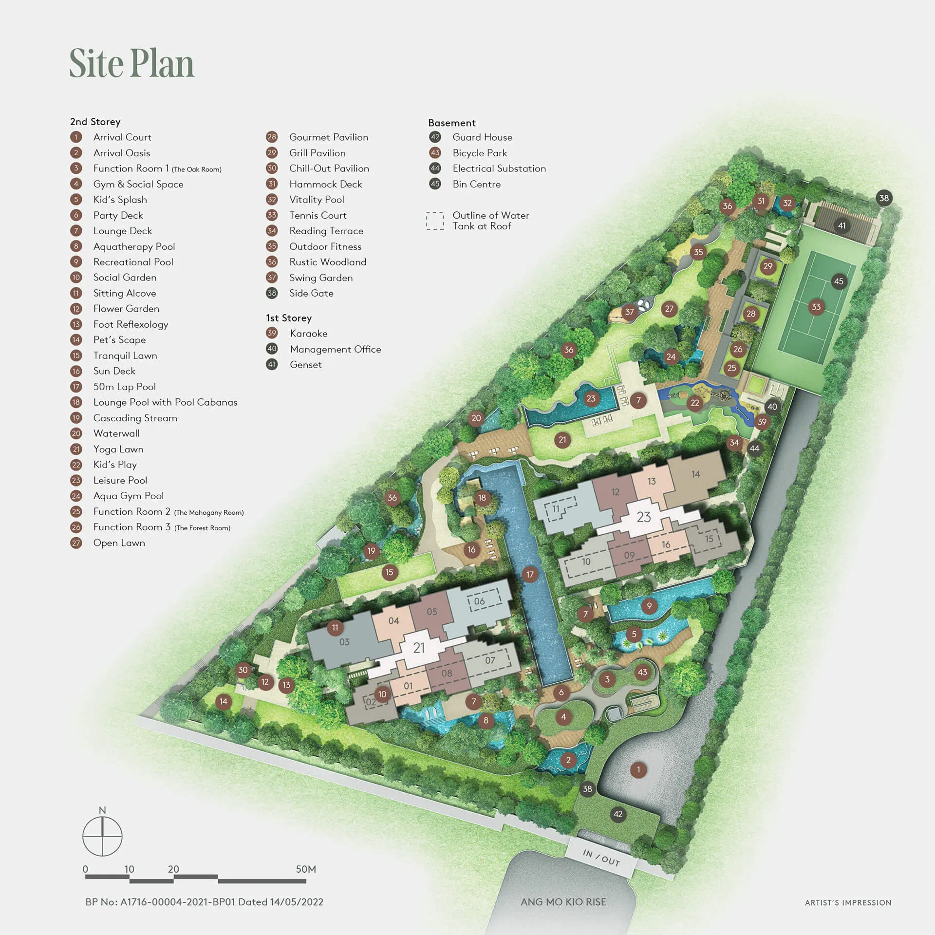 Arrival Court, Arrival Oasis, Function Room, Gym & Social Space, Kid’s Splash, Party Deck, Lounge Deck, Aquatherapy Pool, Recreational Pool, Social Garden, Sitting Alcove, Flower Garden, Foot Reflexology, Pet’s Scape, Tranquil Lawn, Sun Deck, 50m Lap Pool, Lounge Pool with Pool Cabanas, Cascading Stream, Waterfall, Toga Lawn, Kid’s Play area, Leisure Pool, Aqua Gym Pool, Open Lawn, Gourmet Pavilion, Grill Pavilion, Chill-Out Pavilion, Hammock Deck, Vitality Pool, Tennis Court, Reading Terrace, Outdoor Fitness, Rustic Woodland, Swing Garden, Side Gate, Karaoke, Management Office, Genset