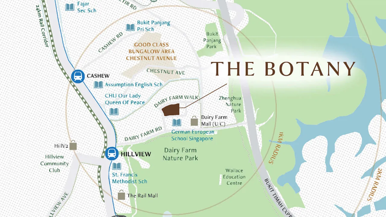 The Botany at Dairy Farm is located along 3–11 Dairy Farm Walk in District 23, a nature-rich enclave near Hillview and Upper Bukit Timah. The nearest MRT stations are Hillview (DT3) and Cashew (DT2).