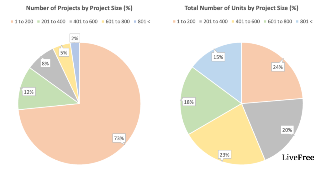 Based on project size distribution, approximately 73% of private non-landed residential projects in Singapore have fewer than 200 units, yet these projects account for only 24% of the total unit supply. Conversely, projects with more than 800 units make up just 2% of developments, but contribute 15% of total supply.