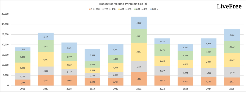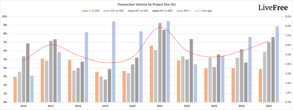 When we examine transaction volumes over the past 10 years, all project sizes appear to move broadly in line with overall market activity.